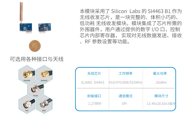 本模塊采用了 Silicon  Labs 的 SI4463 B1 作為無(wú)線(xiàn)收發(fā)芯片,是一塊完整的、體積小巧的、低功耗 無(wú)線(xiàn)收發(fā)模塊。模塊集成了芯片所需的外圍器件,用戶(hù)通過(guò)提供的數(shù)字 I/O 口,控制芯片內(nèi)部寄存器, 實(shí)現(xiàn)對(duì)無(wú)線(xiàn)數(shù)據(jù)發(fā)送、接收、RF 參數(shù)設(shè)置等功能。