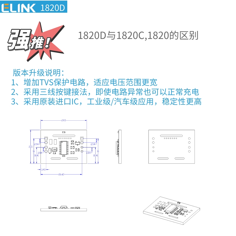 1.EL_YKQ1820D簡(jiǎn)介EL_YKQ1820D是一款用于新能源車(chē)充電槍的無(wú)線(xiàn)控制模塊,可解鎖特斯拉車(chē)型的充電蓋板。EL_YKQ1820D可用于解鎖特斯拉電動(dòng)車(chē)的充電蓋板,使用于各種充電設(shè)備,可選充電功率,無(wú)線(xiàn)遙控解鎖充電蓋板。 2.EL_YKQ1820D主要特性? 無(wú)線(xiàn)解鎖特斯拉充電蓋板? 充電電流可定制? 支持10A/16A/32A/63A? 輸入電源范圍寬(5~12VDC)?