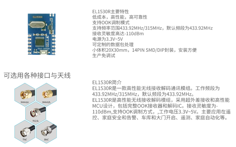EL1530R是一款高性能無(wú)線接收解碼通訊模組。工作頻段為433.92MHz/315MHz,默認(rèn)頻段為433.92MHz。
