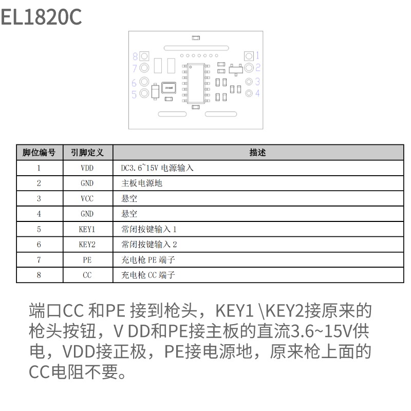 EL1820C 是一款用于新能源車充電槍的無線控制模塊,可解鎖特斯拉車型 的充電蓋板。 EL1820C 可用于解鎖特斯拉電動(dòng)車的充電蓋板,使用于各種充電設(shè)備,可 選充電功率,無線遙控解鎖充電蓋板。