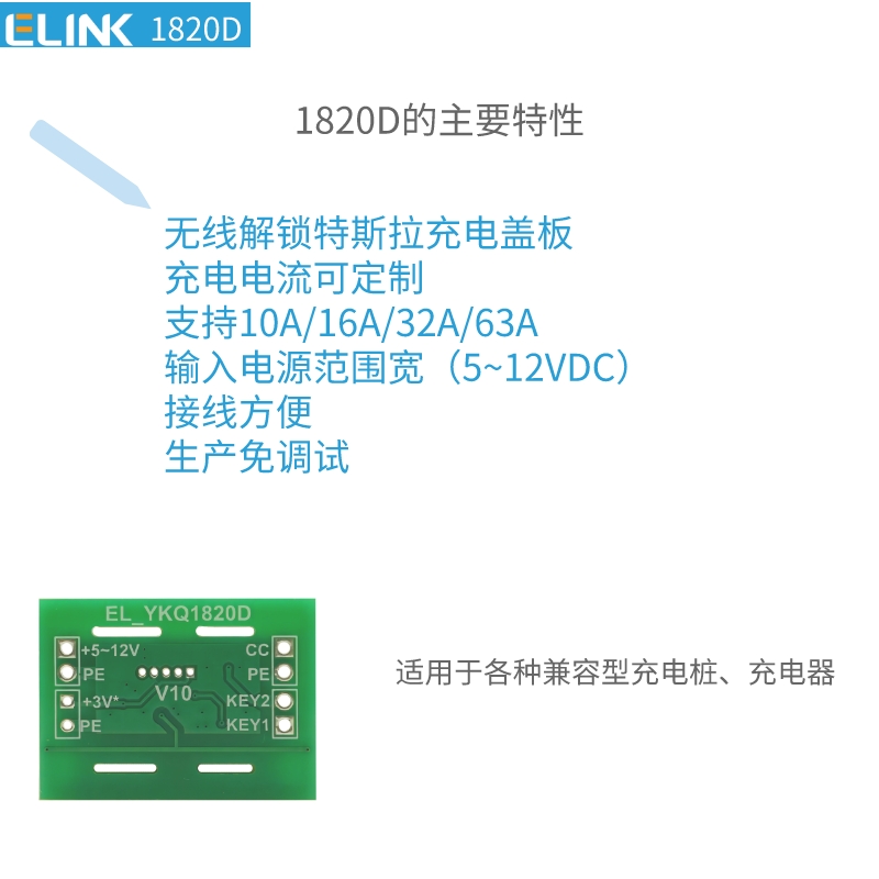 1.EL_YKQ1820D簡(jiǎn)介EL_YKQ1820D是一款用于新能源車(chē)充電槍的無(wú)線(xiàn)控制模塊,可解鎖特斯拉車(chē)型的充電蓋板。EL_YKQ1820D可用于解鎖特斯拉電動(dòng)車(chē)的充電蓋板,使用于各種充電設(shè)備,可選充電功率,無(wú)線(xiàn)遙控解鎖充電蓋板。 2.EL_YKQ1820D主要特性? 無(wú)線(xiàn)解鎖特斯拉充電蓋板? 充電電流可定制? 支持10A/16A/32A/63A? 輸入電源范圍寬(5~12VDC)?